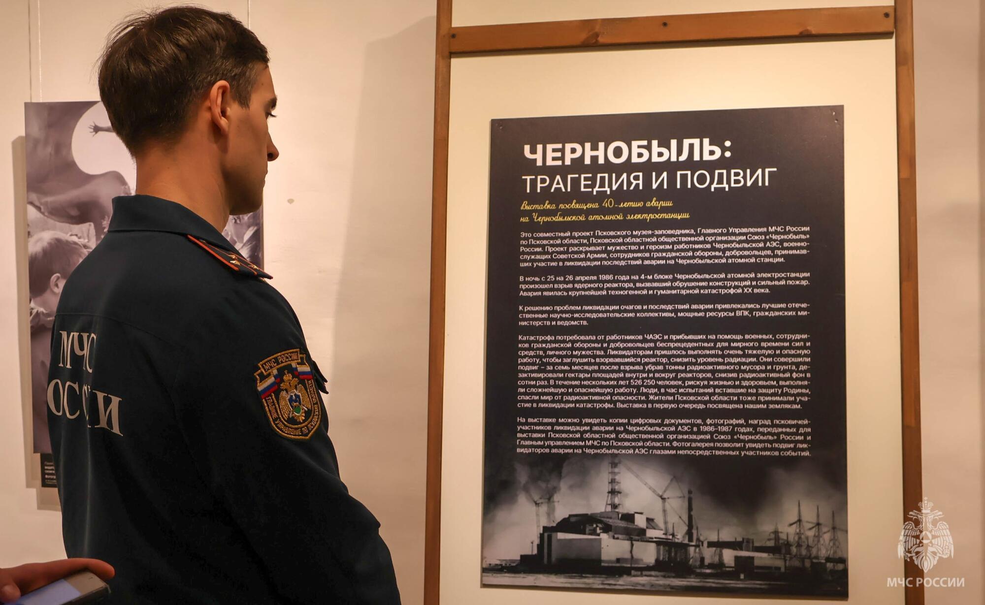 Во Дворе Постникова Псковского музея-заповедника начал работу выставочный проект, приуроченный к 40-й годовщине катастрофы на Чернобыльской АЭС. В церемонии открытия приняли участие начальник Главного управления МЧС России по Псковской области Сергей Лаврухин, спасатели и ветераны пожарной охраны.